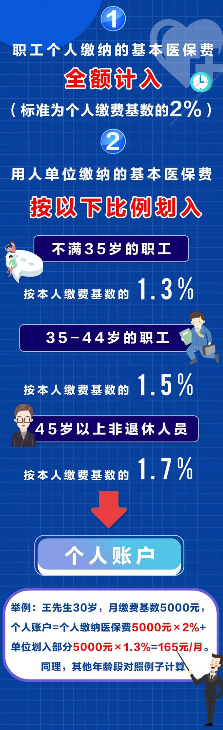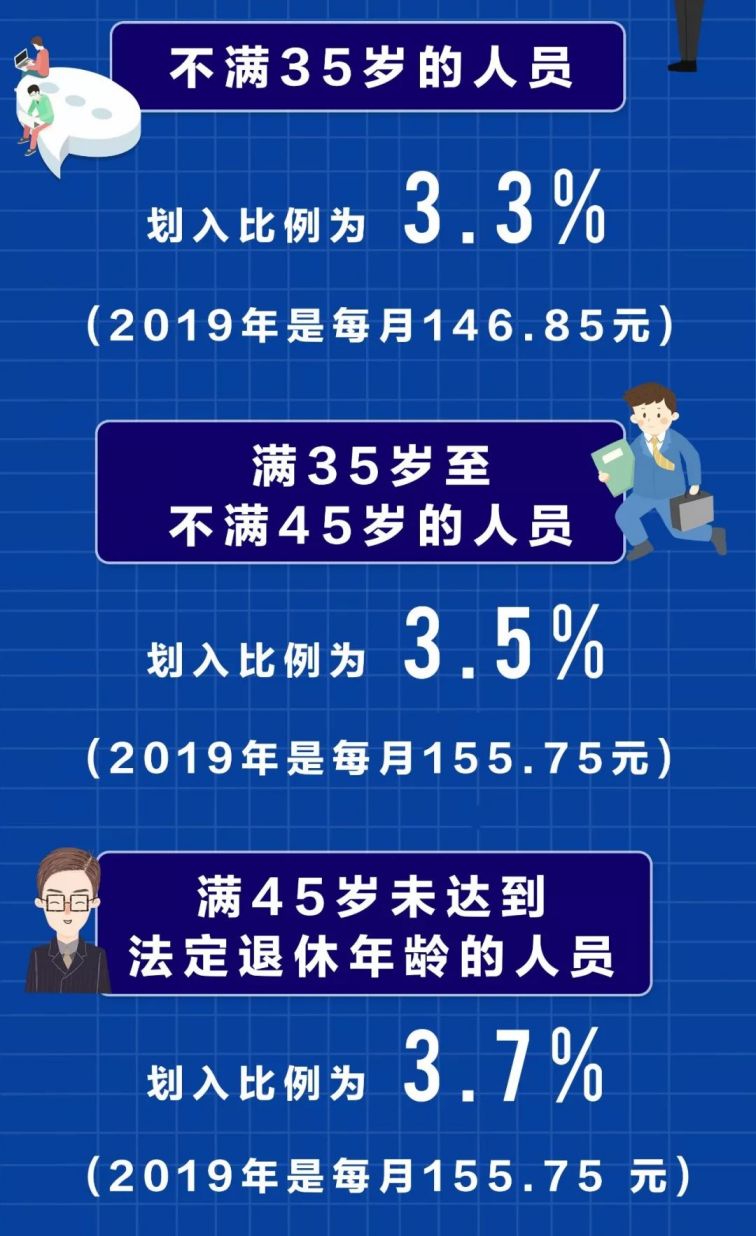 达到法定退休年龄的人员缴费期内划入比例为4%(这里的缴费期是指虽然达到了退休年龄,但是因医保的缴费年限不足,所以继续处于缴纳医保费的期间)。