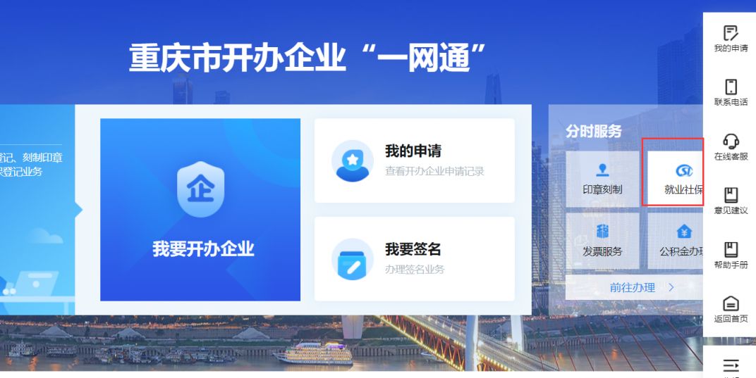 登录重庆市人民政府网上办事大厅(点击这里可以进入),点击“我要开办企业”完成注册登记,在办理注册登记时勾选“就业社保登记”选项就可以完成社保登记,无需再到社保经办机构单独办理。